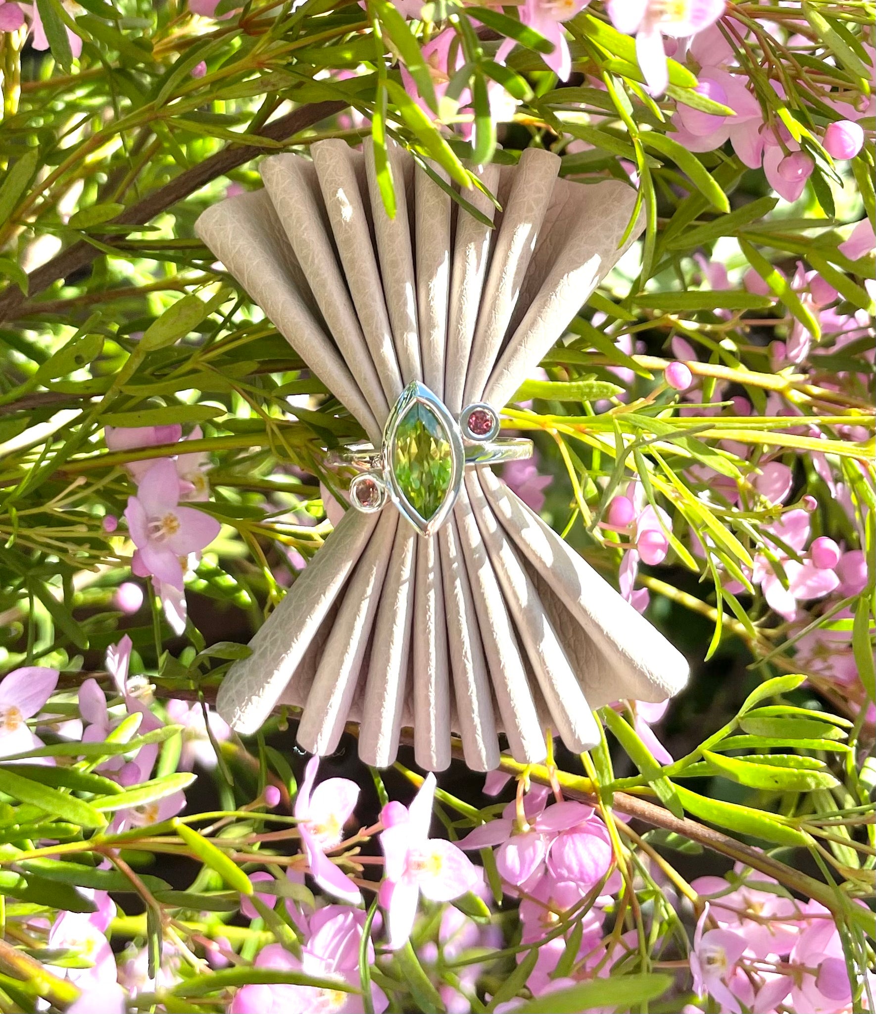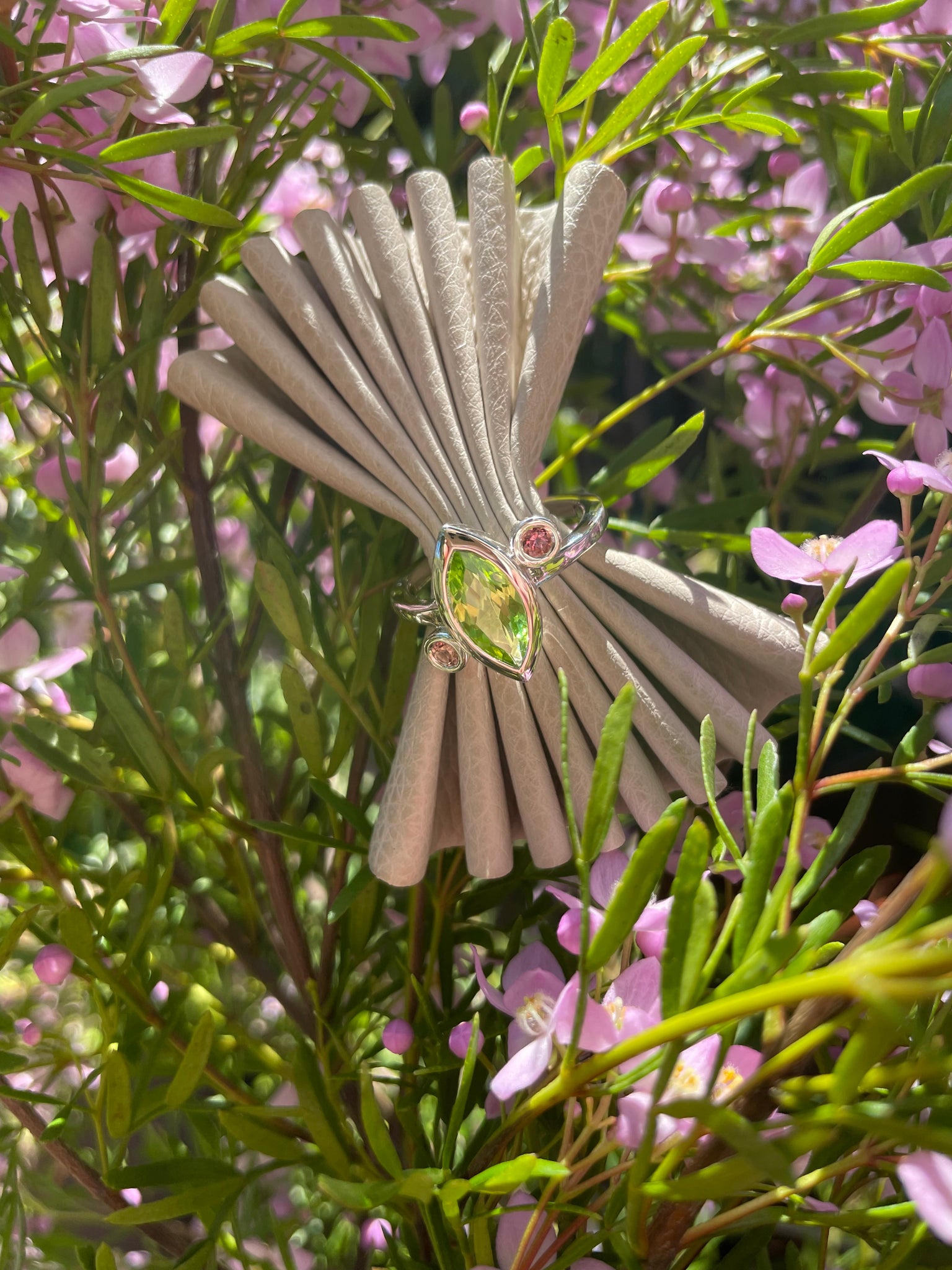 Marquis shaped Peridot offset with a couple of bright pink tourmalines ,fresh growth, flowers in bloom, happy days.