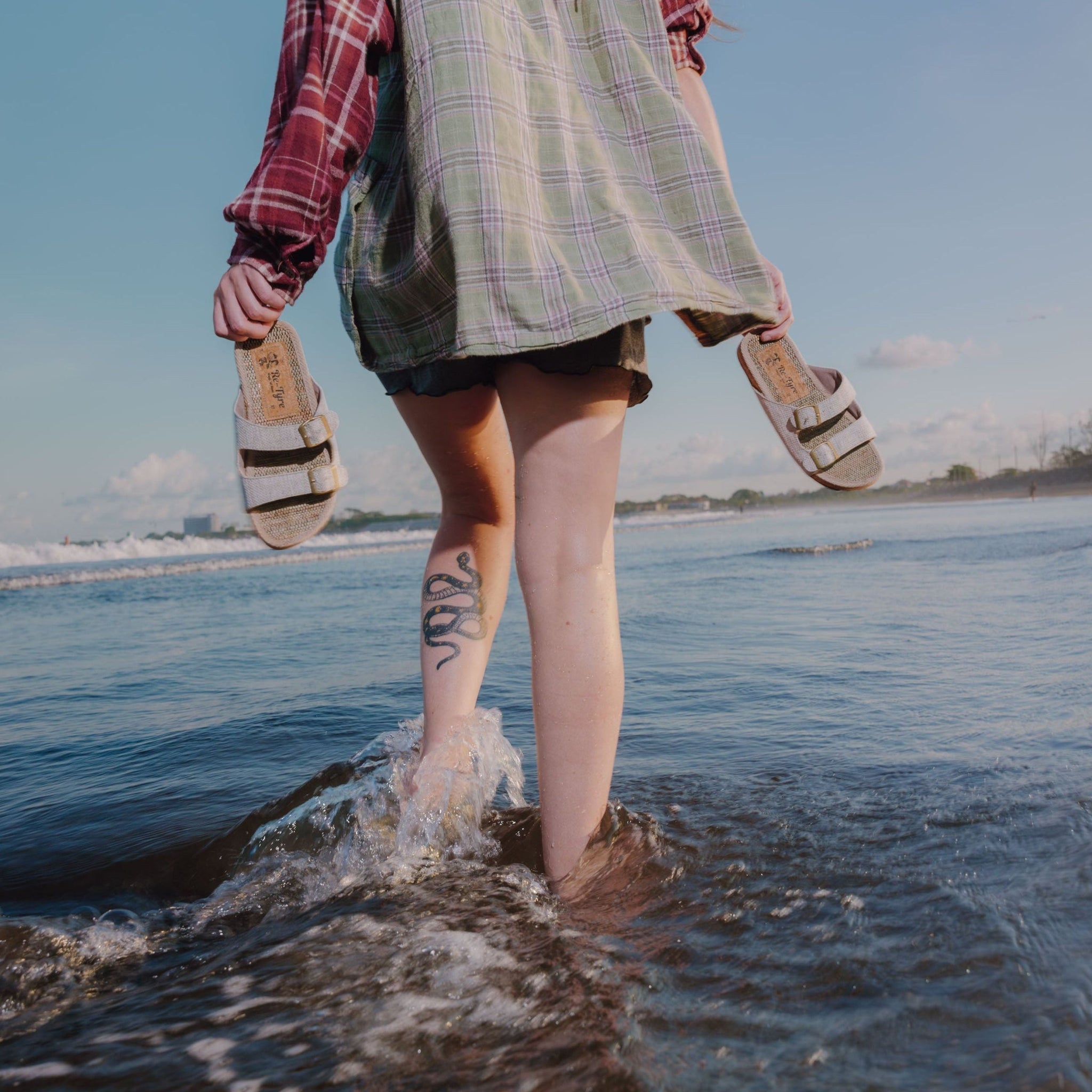 We still love Slides! New style for better size versatility! Adjustable straps for easier sizing and better comfort. Cork and Rattan Upper Soles available. These ones have our popular handwoven rattan upper sole.