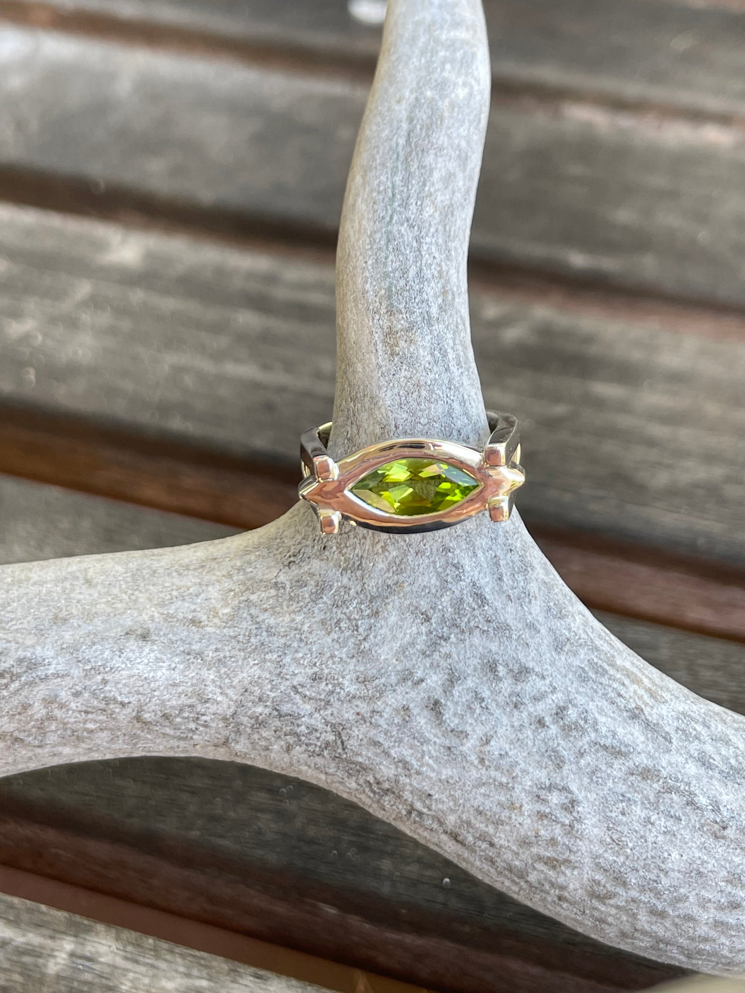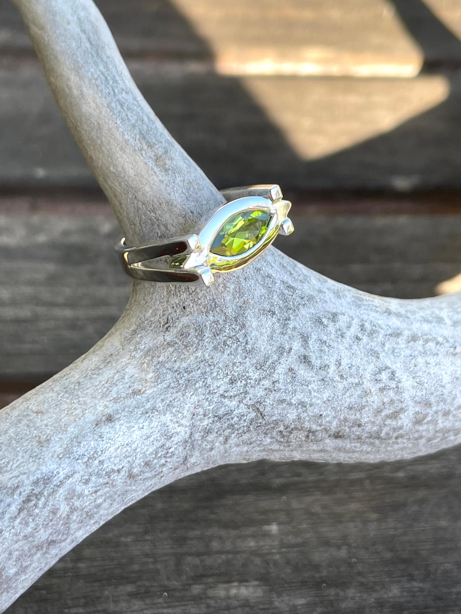 Split band ring, unique contemporary design with marquise cut gemstone or oval cabochon.